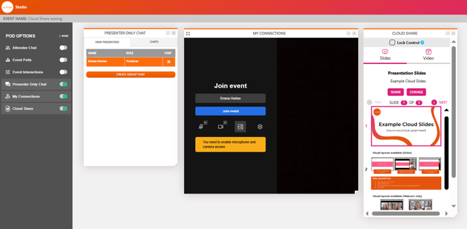 Want to showcase a recorded demo or a pre-recorded presentation while keeping live elements in your event? No problem! Our Cloud Share pod has you covered allowing you to share pre-recorded content for a dynamic and engaging experience.